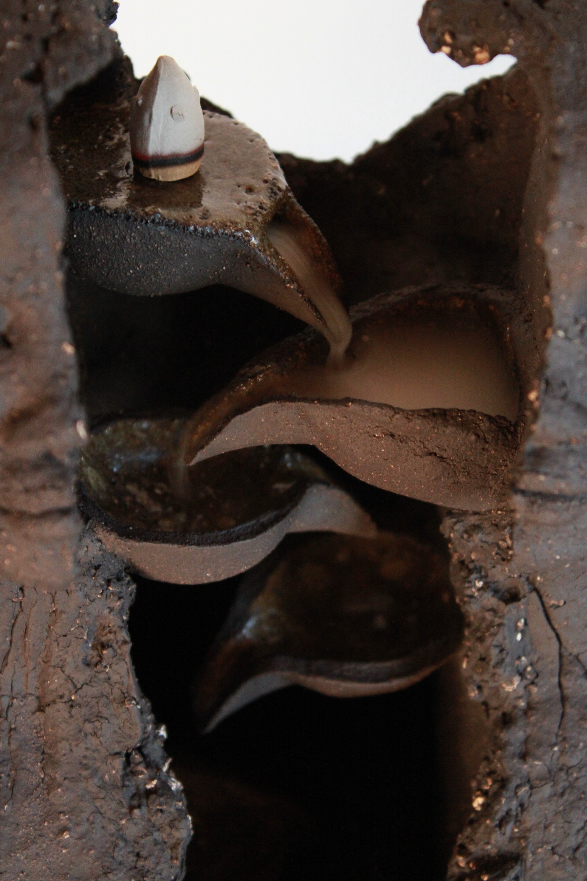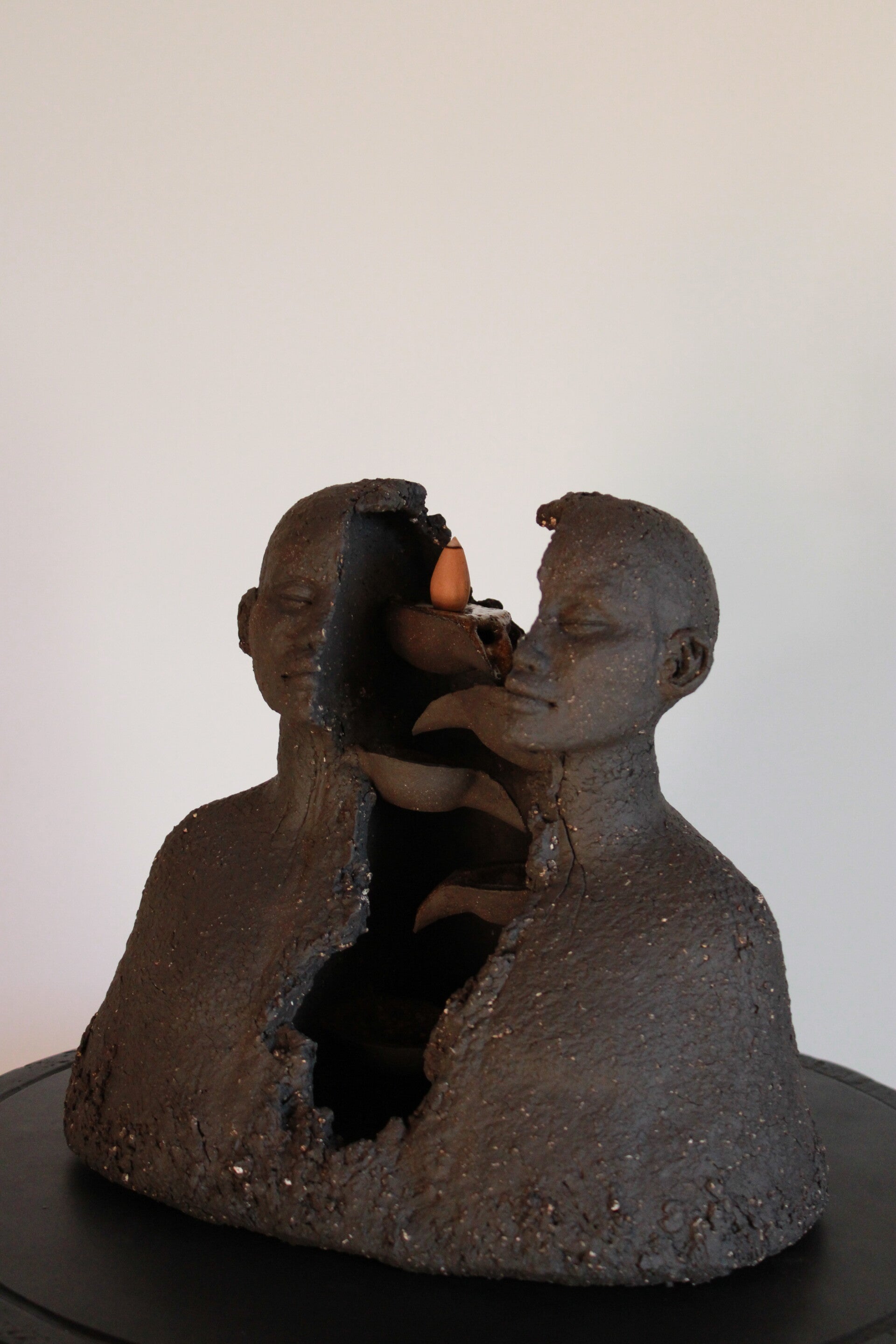 Pensée pour dialoguer avec la fumée de l’encens backflow, cette sculpture donne à la fumée un rôle vivant : elle se déploie lentement, glisse le long des formes et révèle les reliefs de la pièce. La matière sombre du grès noir dialogue avec les volutes d’encens pour créer une présence à la fois minérale et éphémère.