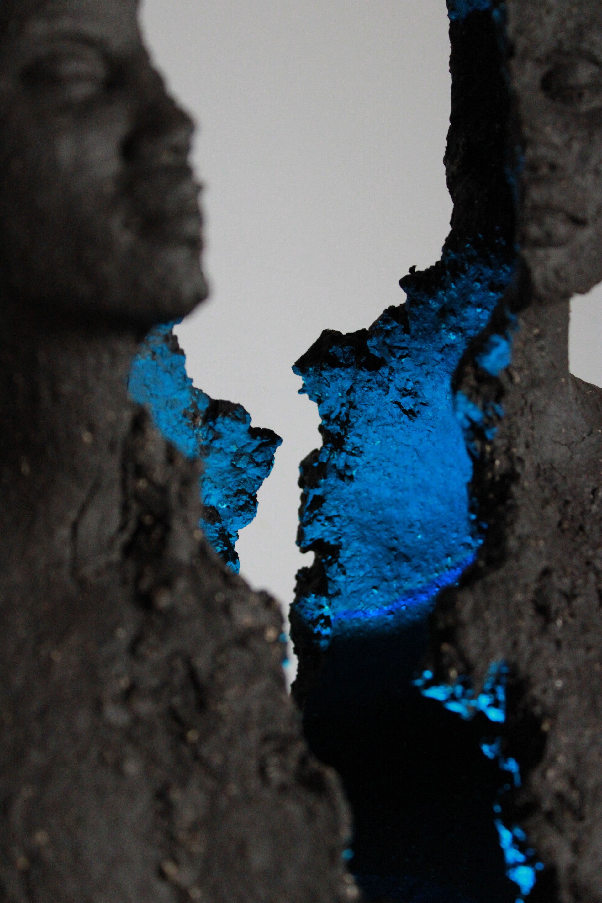 Une faille organique traverse la matière et révèle un cœur lumineux diffusé depuis la base, comme une énergie intérieure en éveil.